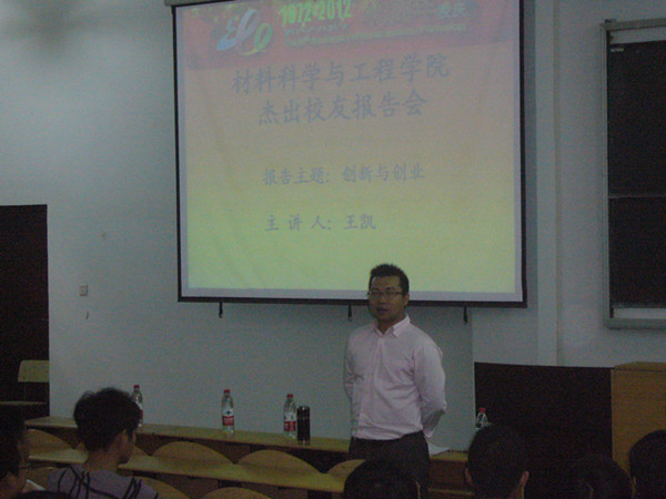 10月9日上午,材料学院在流芳校区工程实践中心多媒体教室举办了一场优秀校友报告会。该院优秀校友王凯总经理为200余名师生做了题为“创新与创业”的报告,会议由材料学院党委书记黄志良教授主持。