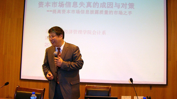 报告会上,陈晓教授结合中国资本市场的实际情况以及国际会计学界对会计失真问题的研究,指出会计信息失真现象的普遍性,强调了会计计量原则的客观、中性和无偏性,全面介绍了会计信息失真的4大来源:改变会计方法、改变应计项、安排实际交易、安排会计交易。陈晓教授还从美国资本市场的监管机制并结合我国资产市场发展现状,指出未来我国资本市场的监管应从政府为主过渡到以市场为主。陈晓教授以渊博的理论知识,丰富的海外经历,用详实的数据、大量的海内外案例,为师生作了一场内容丰富、生动精彩、深入浅出的学术报告。报告结束后,师生们踊跃提问,所问问题包括中国宏观经济走向、中小企业融资、创业和创业板市场、会计职业发展前景等,陈晓教授幽默诙谐地一一解答了师生们的提问,掌声经久不息。